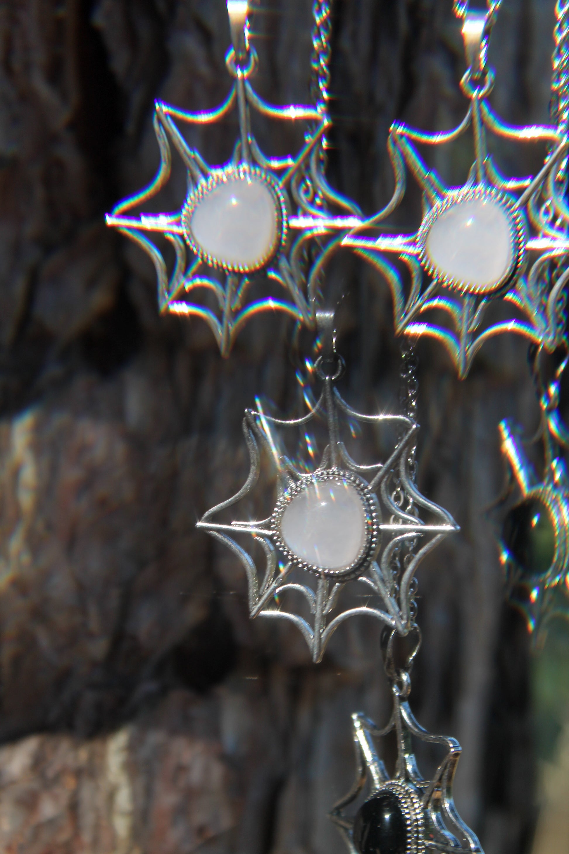 Our Cobweb Gemstone Necklaces are definitely a must-have for Spooky Season! An Alloy based Cobweb Pendant with a beautiful Gemstone Crystal fixed in the middle.