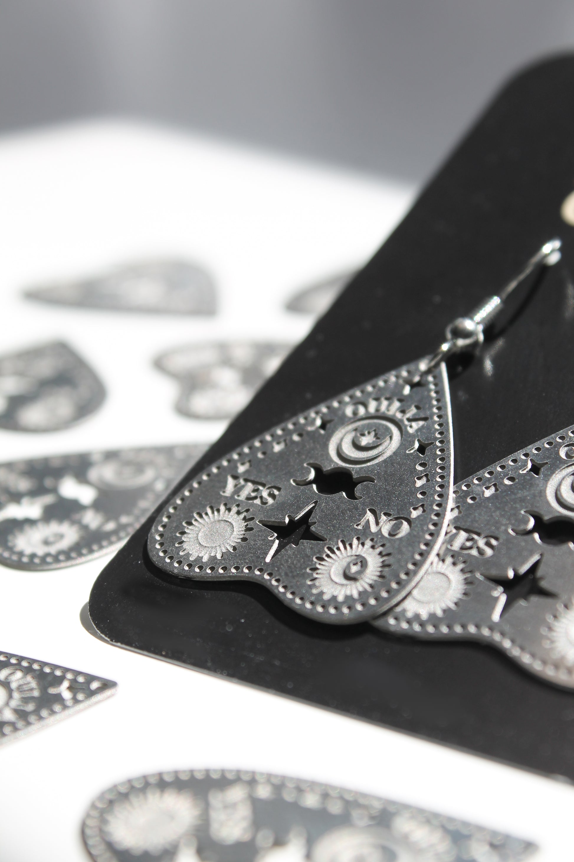 Get into the spooky spirit with our Planchette earrings! Crafted from stainless steel, these earrings feature a unique planchette design and secure stainless steel hooks. Perfect for adding a touch of darkness to your everyday look!