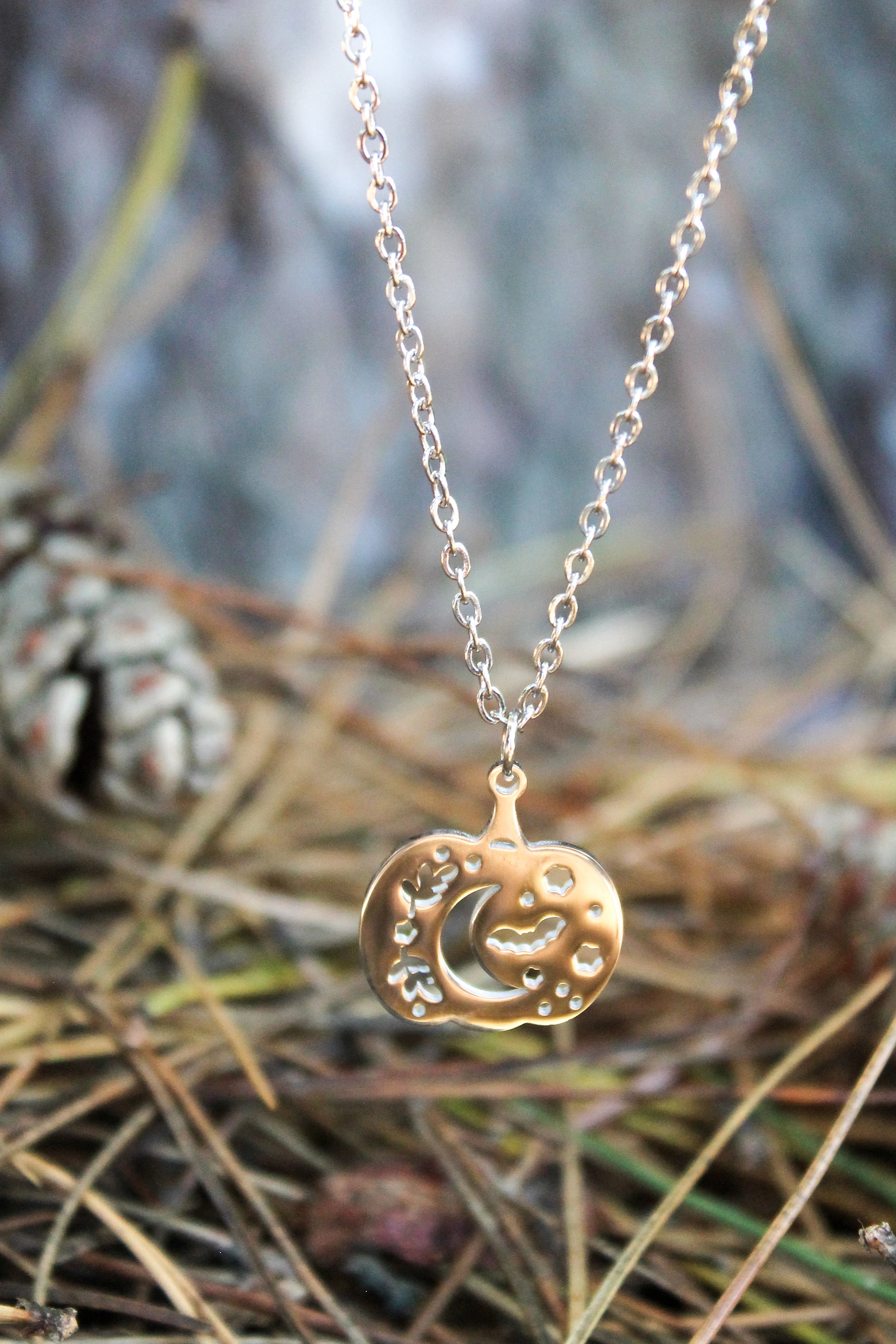 Celebrate the spirit of Autumn and Spooky Season with our Silver Pumpkin Necklace. Made from durable Stainless Steel, and also available in Gold!